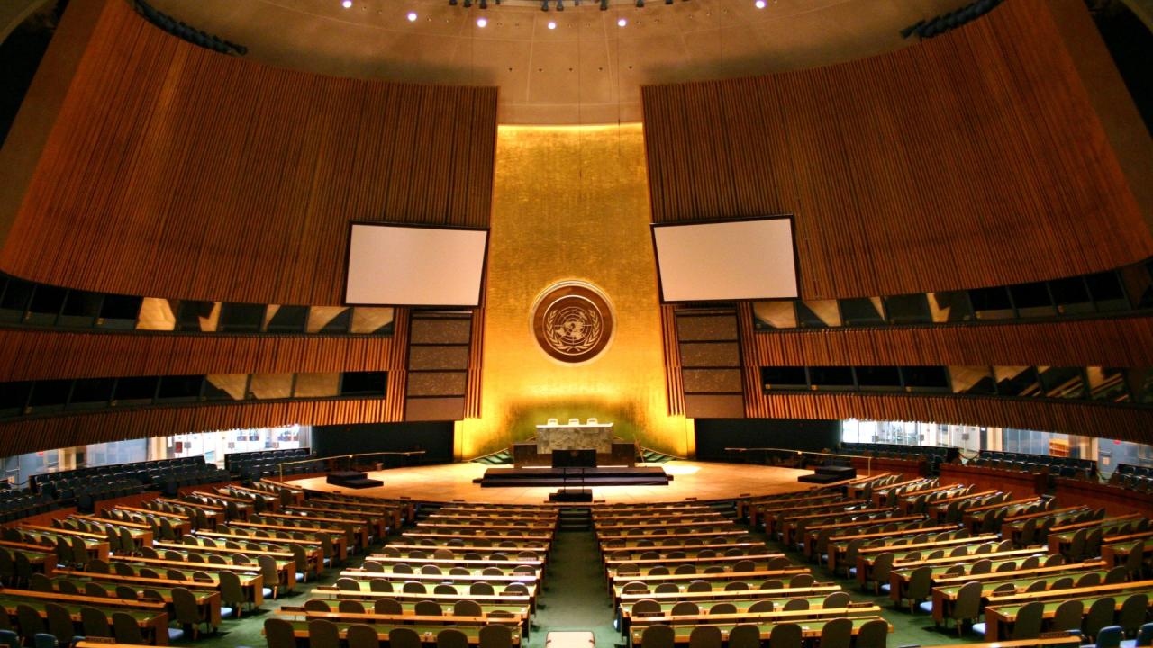 The General Assembly is the primary deliberative assembly of the UN. Composed of all UN member states, the assembly gathers at annual sessions at the General Assembly Hall, but emergency sessions can be summoned.[109] The assembly is led by a president, elected by the member states on a rotating regional basis, and 21 vice-presidents.[110] The first session convened on 10 January 1946 in the Methodist Central Hall in London and comprised representatives of 51 nations.[34] The General Assembly is the only UN organ in which all member states have the right to be represented and vote.